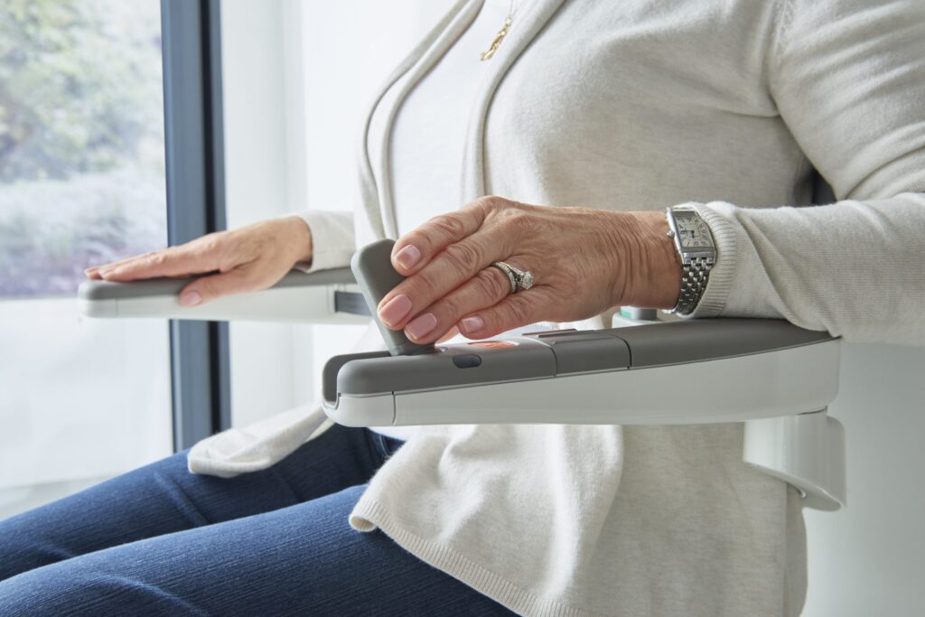 Der integrierte Joystick ist mit einem bequemen Soft-Touch-Griff ausgestattet und so konzipiert, dass er bei Nichtgebrauch ordentlich in die Armlehne eingeklappt werden kann. Wenn Sie sich für den Treppenlift Flow X entscheiden, stellen Sie die beste Lösung für Ihr Zuhause sicher. Mit einer einzigen diskreten Schiene kann dieser Treppenlift maßgefertigt und an jede Treppe angepasst werden. Sie sind sich unsicher, ob ein Treppenlift auf Ihre Treppe eingebaut werden kann? Um sicherzustellen, dass wir alle Möglichkeiten in Ihrem Sinne prüfen und berücksichtigen können, rufen Sie uns gerne an und lassen Sie sich unverbindlich beraten. So können Sie sicher sein, dass der Einbau Ihres neuen Treppenlift glückt!